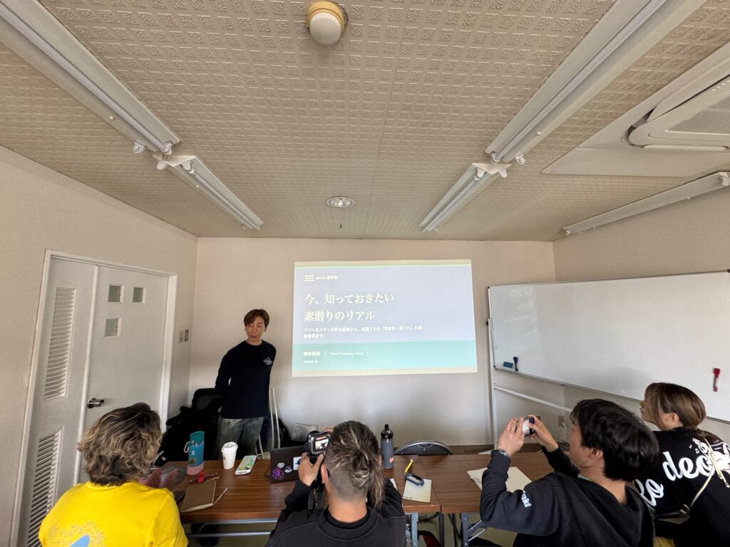 座学では、スキンダイビングとフリーダイビングの違いや、素潜りにおける耳抜きについて、その他いろいろなことを学ばせていただきました。